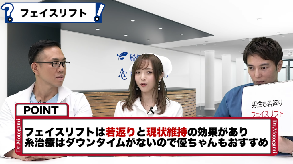 並木優:男性も若返りフェイスリフト。これはやった方がいいと思います。私もフェイスリフトの糸をやっているんですけど、ダウンタイムが無いんですよ、糸に関しては。若返りと(現状)維持もありますよね?