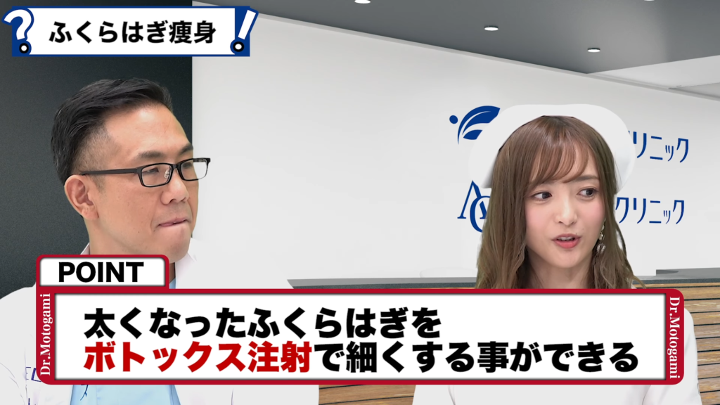 元神先生:これもボトックス注射で!ずっと運動をしていた陸上部や野球部の方が意外と気にして手術を受ける方はいらっしゃいますね。足が太すぎるという事で。