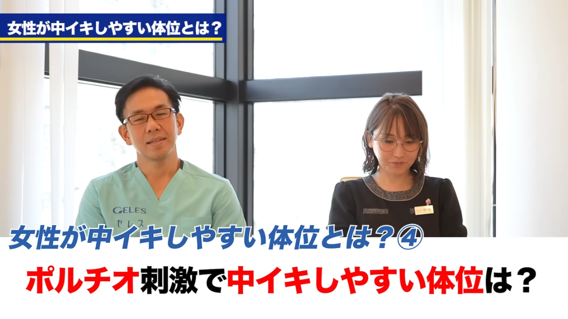 橘:次にポルチオ刺激で中イキしやすい体位というところ、次にこちらちょっと教えていただきたい。
