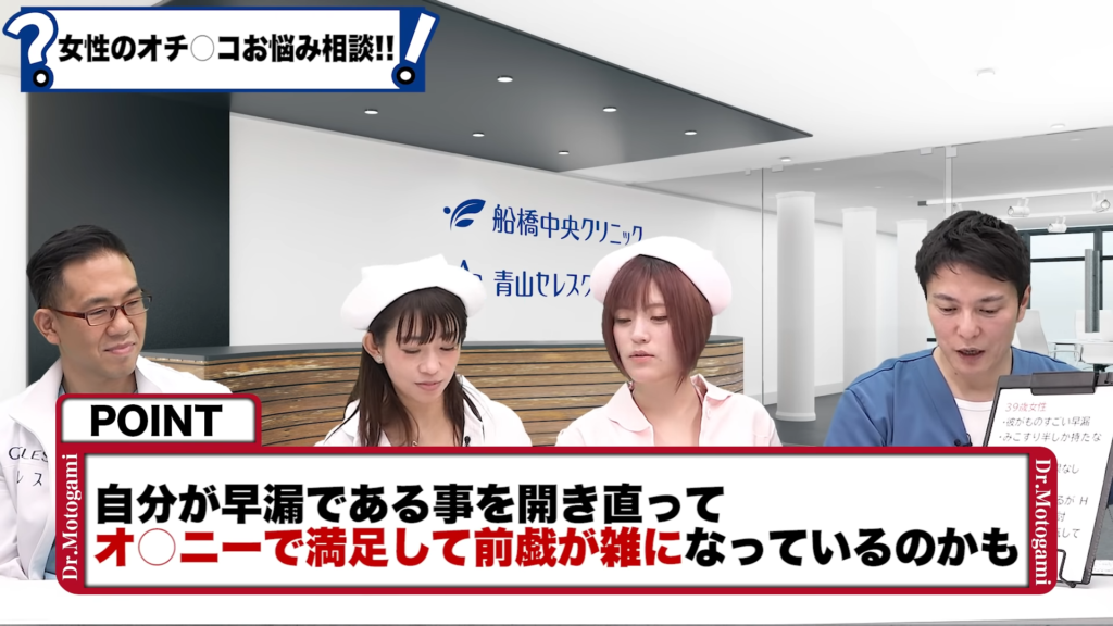 男性カウンセラー:なるほどね。ここにいてもらってもいいかもしれないですね。二人で背中越しに僕らのほう向いててくれて。公開カウンセリングをしたいかもしれないですね。今回は早漏の彼氏と亀頭の硬さがない、ゴリゴリしないという女性からの相談でございました。この話はちょっとシーンってしちゃう感じ。