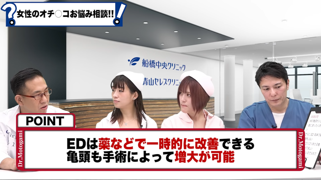 元神先生:EDから旦那さんに伝えるといいですよね。そういう薬とかもありますし、そこからクリニック来たら亀頭もでかくできるんだって本人に気づいてもらう。