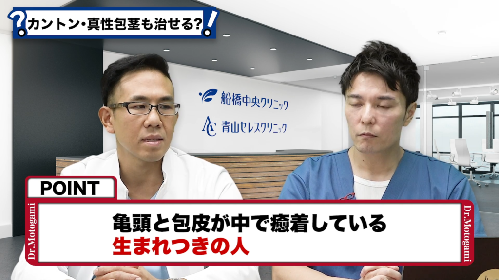 元神先生:生まれつき癒着していて亀頭と包皮が中で癒着してる(くっついてる)状態が起こって剥けない方はいます。これは生まれつきですね。あともう1つは幼少の頃から包皮を剝いて亀頭を出すことをしなかった場合は、どうしても大人になってから剥こうとしてもやっぱり痛みが出たり、カントン包茎の状態になります。