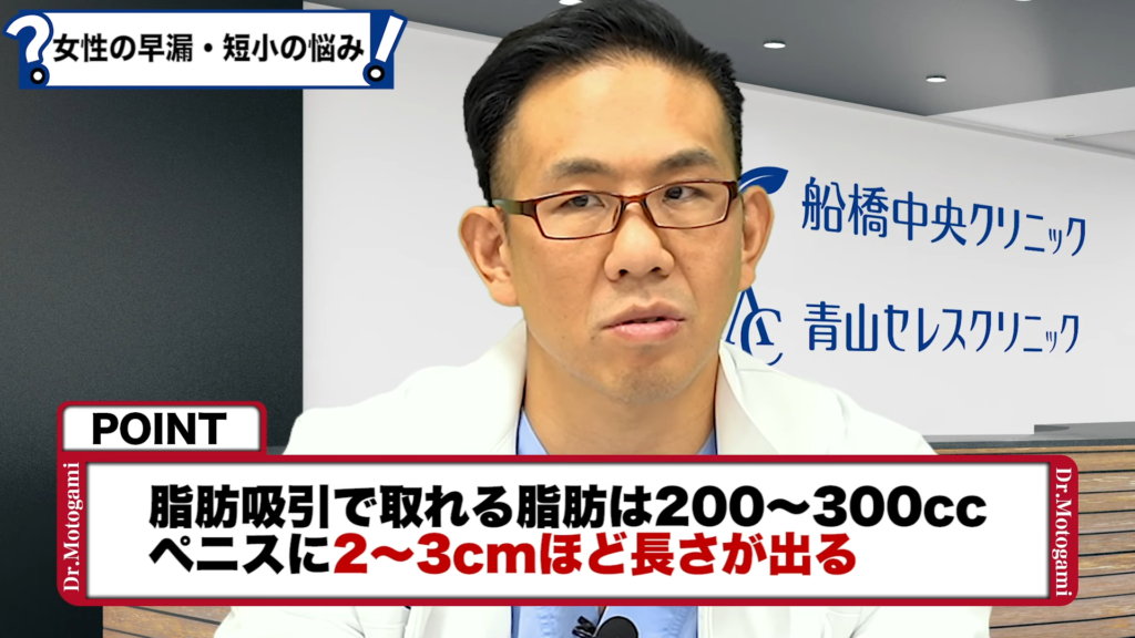 元神先生:脂肪としては200~300ccぐらい取れますし、ペニスの長さとしては2~3cmぐらい長さ出るんじゃないですかね。