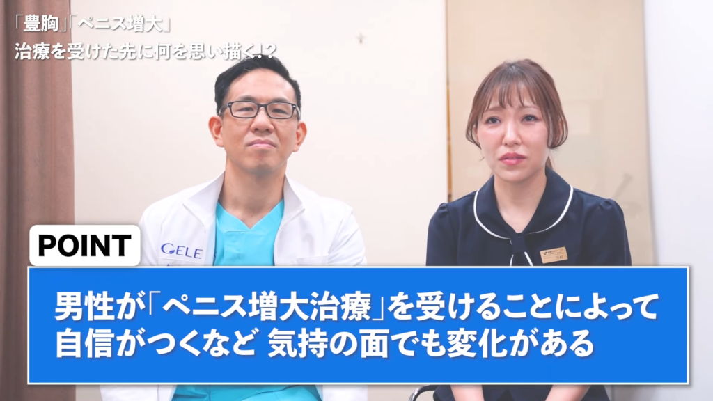 橘:今聞いてる感じだと、やっぱり男性と比較的近いというか、「追い求めてるもの」というのは。でもやっぱり男性でも元々すごい気になってて隠すとか、あとは逆に治療して大きくなった人とかって、前にいらっしゃったのが、当院にご相談に来ていただいて治療を受けたんですけど、治療を受ける前は結構声がボソボソっと、ちょっと小さいタイプの方だったんですね。ちょっと内気な感じというか。そういう方がいたんですけど、通院していただいて治療を何回か受けたんですけど、そうするとやっぱりペニス大きくなるじゃないですか?何回かやると。その後から徐々に、服装が来る度に徐々に変わっていく。ちょっと派手めになってくるんですね。ちょっとオシャレを取り入れてきたりとか、結構話し方が変わってきたりとか、やっぱり自信がついたみたいで。そういう変化ってそこだけでもあったりすると思うので、そのへんは同じかもしれないですね。