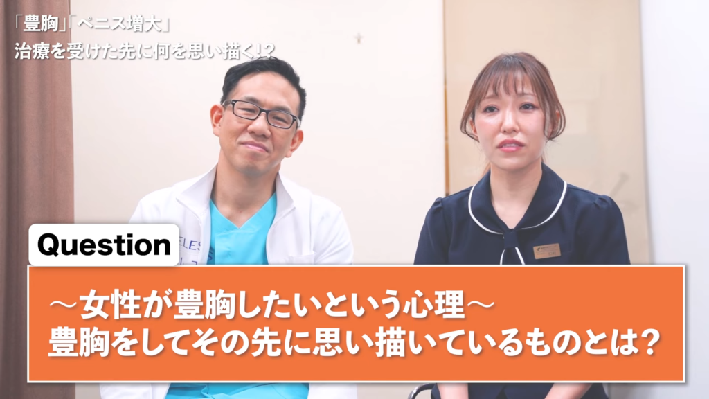 橘:異性から見ると「なぜそんなに大きくする必要があるの?」とか、「そのままでありのままでいいのに」という意見も結構多いと思います。女性は「胸を大きくすること」男性は「ペニスを大きくすること」その先に何を思い描いているのか?というのを紐解いていく企画となっております。ちょっと説明が長くなっちゃったんですけれども、ペニス増大と豊胸は基本似ている、と先生もよくおっしゃられているんですけれども、「大きくしたい理由」というところが「両者どこにあるのか?」というところ「何を理想としてやるのか?」というところを聞いていきたいなと思うんですけれども、女性側の意見に関しては、今まで数多くバストの相談を受けている川村さん、男性側の意見はペニス増大の匠、先生に聞いていきます。