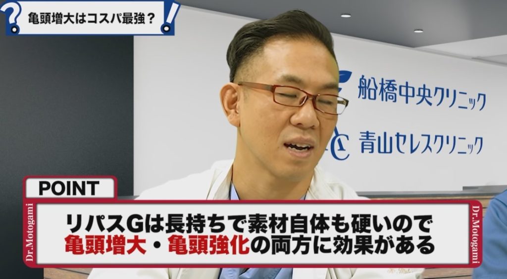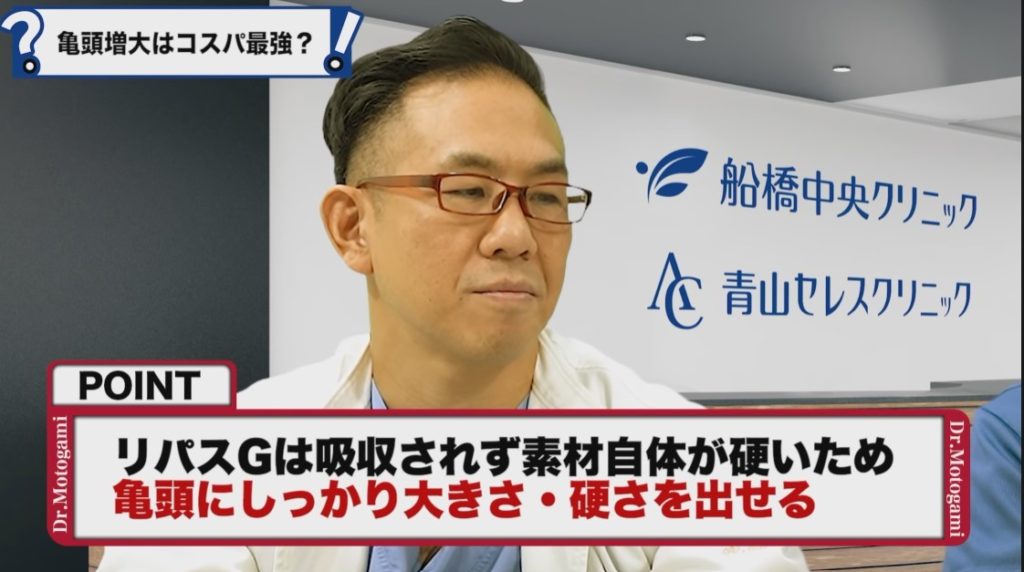 男性カウンセラー:実際に大きさも出て注入部位を触ると硬くなっていますよね。弾力のある丈夫な亀頭という印象になりますよね。これはもうリパスGが一番長けている?