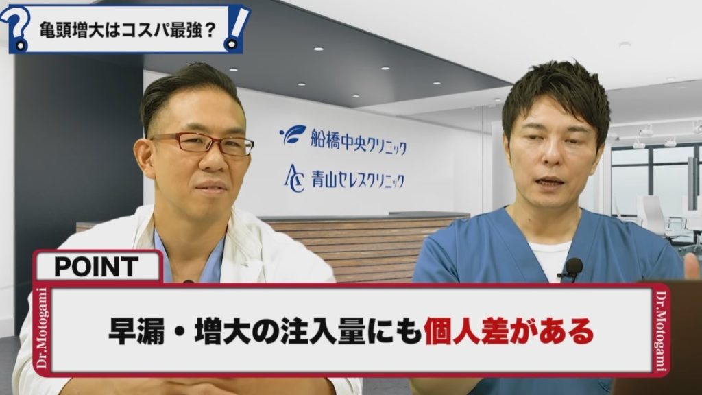 元神先生:元々の亀頭の大きさにもよる。元が大きい人が更に大きくしたい場合は結構な量を入れないと変化の違いが出しにくいっていうのはありますね。