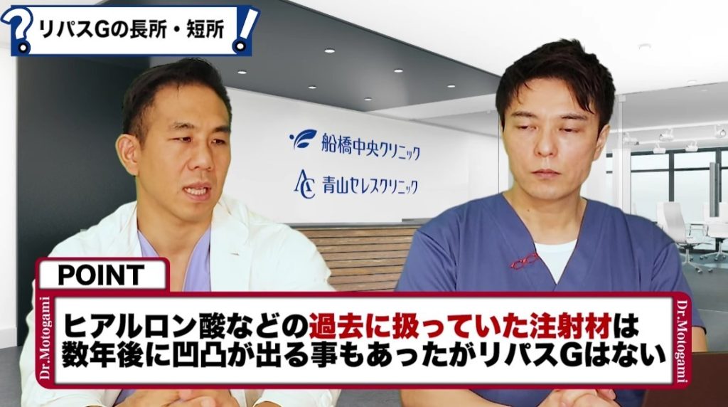 元神先生:なりにくいですね。ヒアルロン酸とか過去に入れた注射剤で問題点はですね、数年後とかにすごい凹凸が出たり、うちの患者さんはあんまり居ないと思うんですけども、他のクリニックでヒアルロン酸入れたとかでボコボコになっている患者さんとかたまに来るんですけど、あぁいうことはないですよね。リパスGはうちも導入してからもう何年か経ってますけど、居ないですよね。