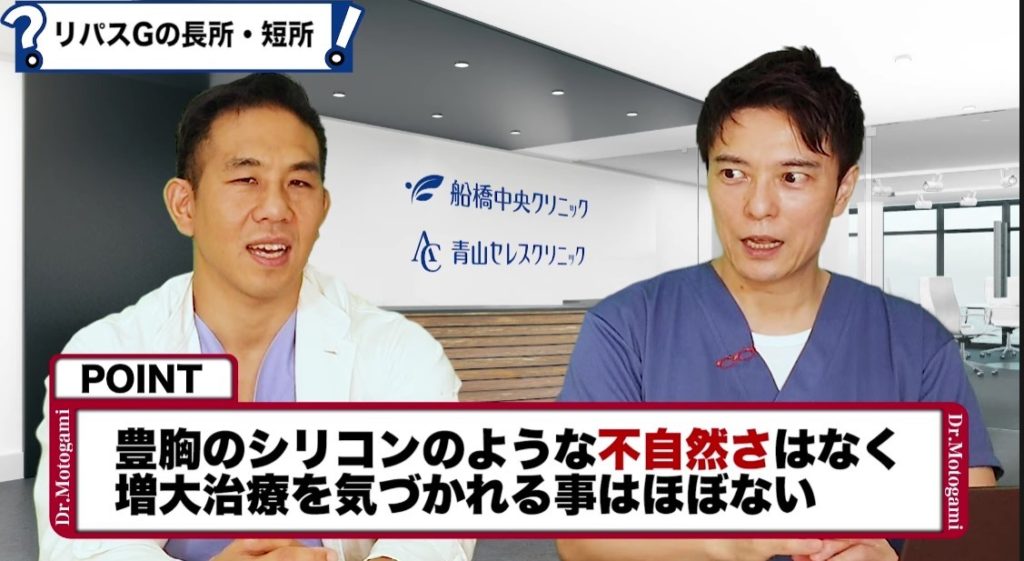 男性カウンセラー:一番わかりやすいって言えばわかりやすいですね。女性の胸に注射をして大きくするのと同じですね。ヒアルロン酸やコラーゲン、アクアミドやバイオアルカミドなどこれまで使われた素材なんかも紹介した回もありましたけども、元神先生が圧倒的に推しているのがリパスGですね。