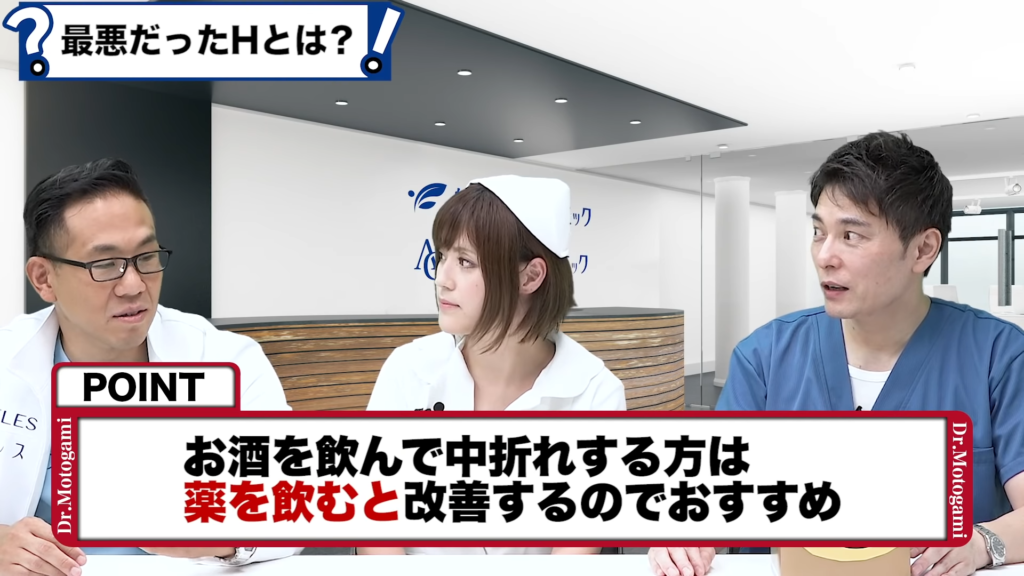 元神先生:絶対、薬飲んだほうがいいですよ、男がね。バイアグラとかそういった薬は、普段は全然問題ないけどお酒飲むとどうしても中折れする方は、薬ちょっと飲むと全然中折れしなくなりますから効くんですよ、そういう場合も。