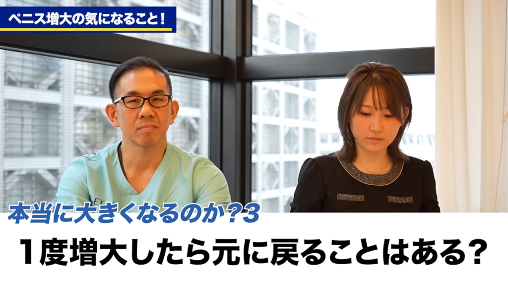 橘:何が正解なのか逆にわからない方も多くいると思うので、今回は質問を26個用意しました。それを先生にお答えいただきたいと思います。それではまず早速、男性がペニス手術に関して気になることの質問。まずは一番多い「本当に大きくなるの?」という系の質問を聞いていきたいと思います。