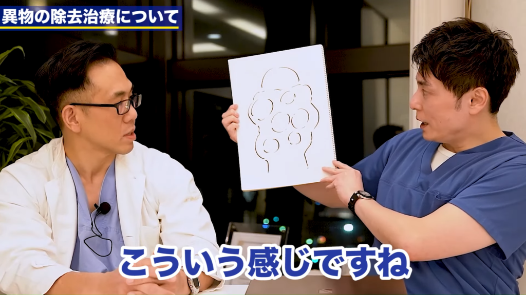 元神先生:歯ブラシの柄は簡単です。ちょっとだけ切開して全部出せます。問題なのは液体シリコンとかワセリンでして、医療用のものじゃないので、こういうものは皮膚と一体化しちゃってるんですね。取り除き方はもう皮膚ごと取り除くしかないんですね。必然的には全部は取れないってお話はしてます。なるべくかたちがきれいになるように考えながら取り除いたりしてますね。