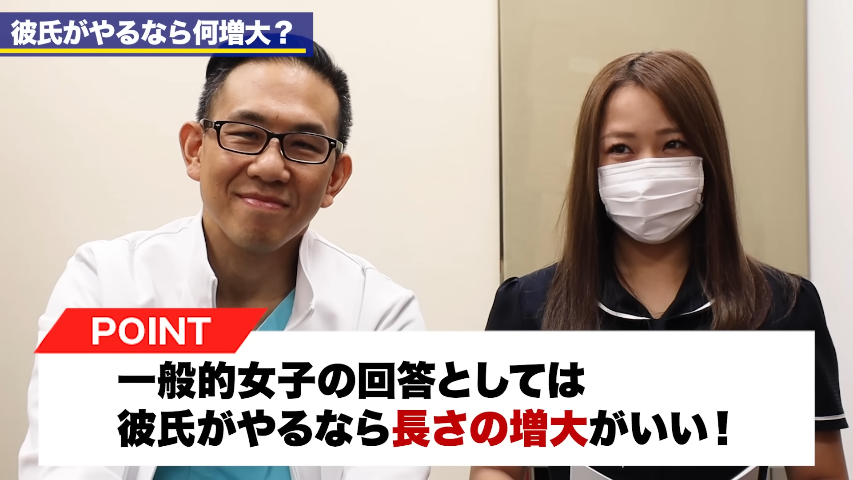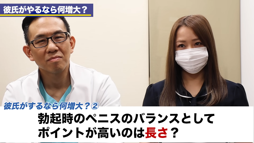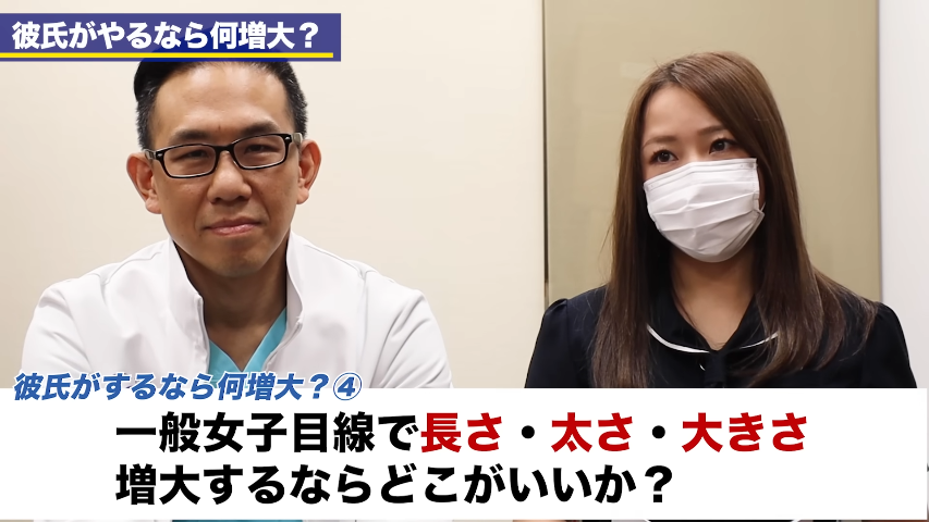 橘:今回の企画「一般女子が決める、彼氏がやるなら何増大?」今回は「もし彼氏がやるなら何増大がいいのか?」ということを聞きたいと思います。前回の企画ではサイズの重要性というところ、女性からすると、そんなに気にしなくていいよという話だったと思うんですが。今回はその中でもバランス的な部分、全体的なサイズではなくて、「性行為に対して良いポイント。その点で一般女子に受ける増大治療は何なのか?」ということを直接一般女子に聞いていきたいと思います。今までも結構多くの方に聞いてきました。ペニスのサイズ、増大するならとこがいいか?AV女優の皆さん、そして石橋さんの先輩である川村さんにも前回も聞いていきました。それこそ、亀頭のカリ高だったりとか、それこそ女優さんで言うと、竿が太い方がいいとか、長さがあって奥突かれるといいとか。結構いろいろなポイントがあると思うんですけれども。まず、ペニスサイズについて。