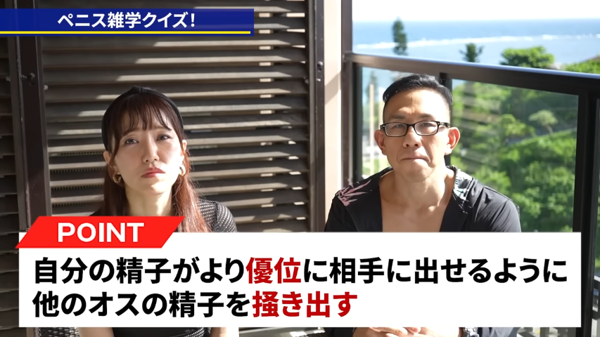 橘:他の動物と比べて人間は比較的フリーセックスというかですね、他の生き物の場合は交尾をして子孫を繁栄するっていうところは同じなんですけれども、ただやっぱり人間の場合は、その1人のオスとセックスをした後に、そのあとすぐにまた他のオスとですね、セックスをするという風習がある。ずっと昔からあったっていうことで、それが自分の精子がですね、より優位に相手に出せるように他のオスの精子を掻き出すと。