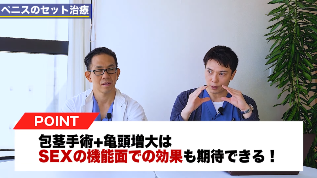 男性カウンセラー:包茎手術をベースに考えると包茎手術プラス亀頭増大はオーソドックスですけれども、余った皮がなくなることで亀頭が大きく見える。さらに亀頭を大きくすることでボリュームアップして見せることができるし、セックスの機能面での効果も上がりますね。