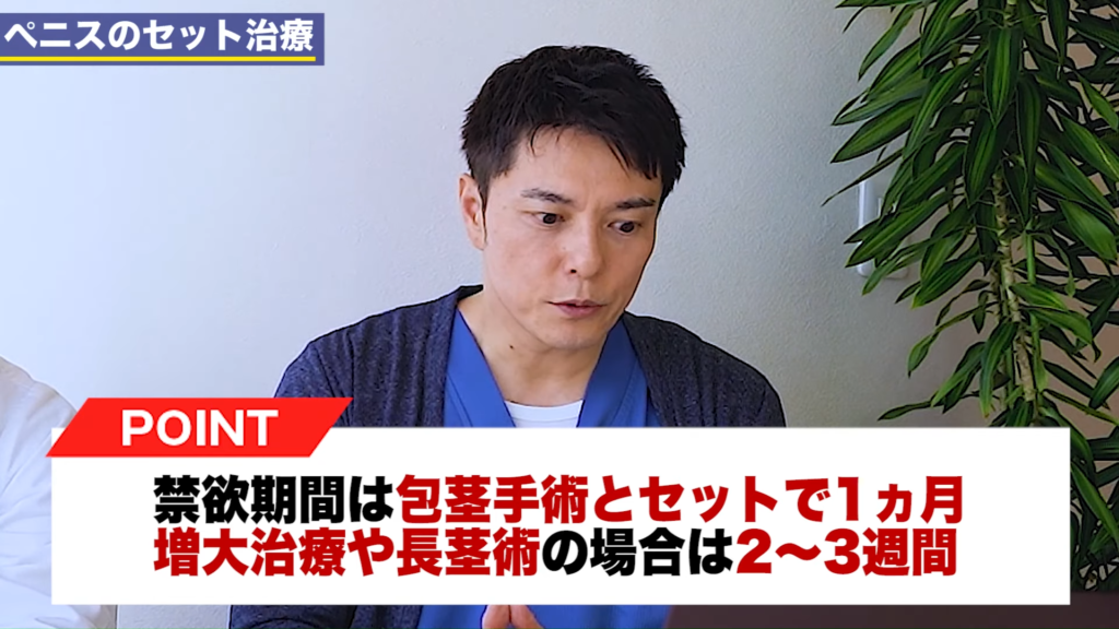 男性カウンセラー:例えば包茎手術を受けて1カ月間禁欲。亀頭増大を受けて2週間、3週間禁欲。合計で6週間から7週間禁欲ではないんですよね。長いほうの禁止期間を守ってもらえばいいということですね。