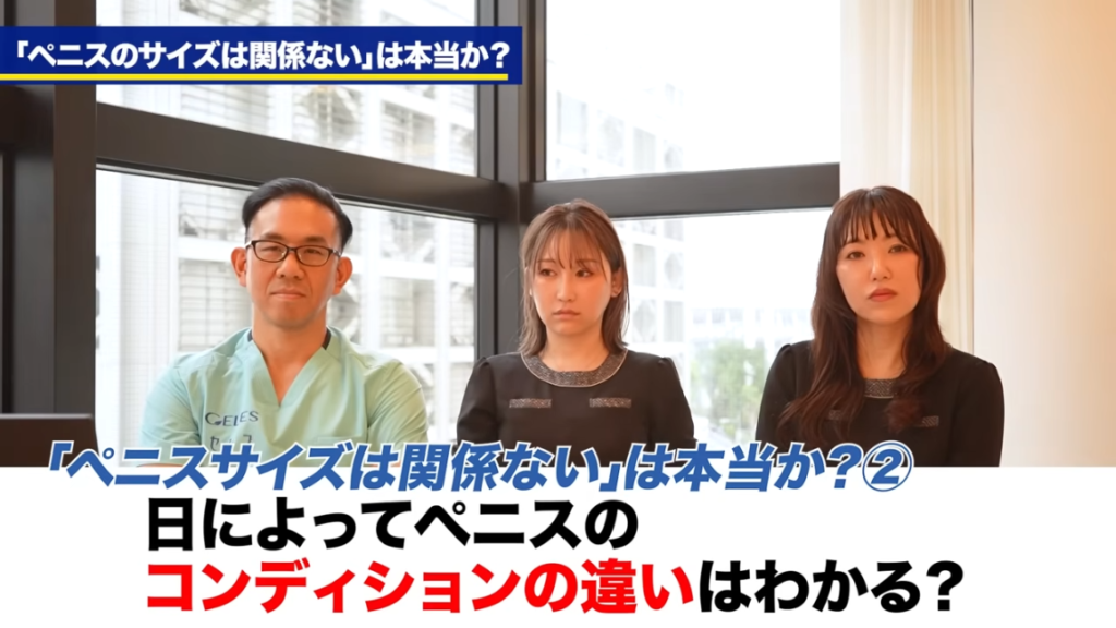 :サイズが大きい男性に対して、これもお二人に聞きたいんですけど、日によって、ちょっと大きく感じるとか、今日はちょっと痛いなとか、なんかそういう日に寄ってのコンディションによる違いみたいな、なんかそういうのってあったりするんですか?