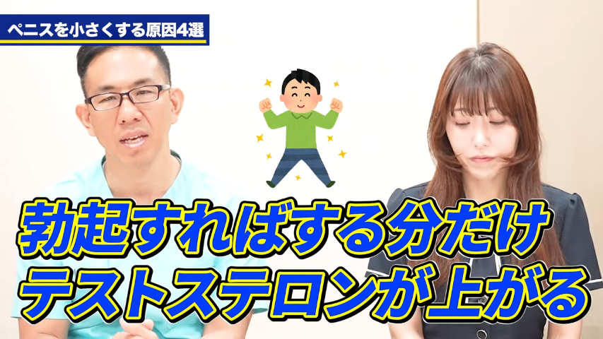 橘:こんな感じでペニスが萎んでいってしまう要因というのが色々あるんですけれども、根本的な原因でいうとテストステロン、あとは肥満だったりとか、そういった部分が大きいですよね。