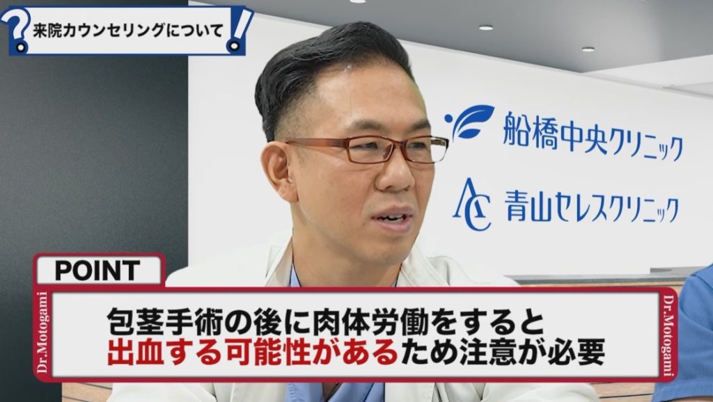 元神先生:そうですね。包茎手術の場合は肉体労働はそんなにできない。出血することもありますから。注意が必要ですね。