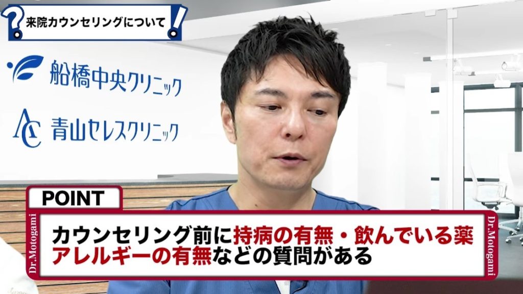 カウンセリング前に持病の有無・飲んでいる薬・アレルギーの有無などの質問がある。