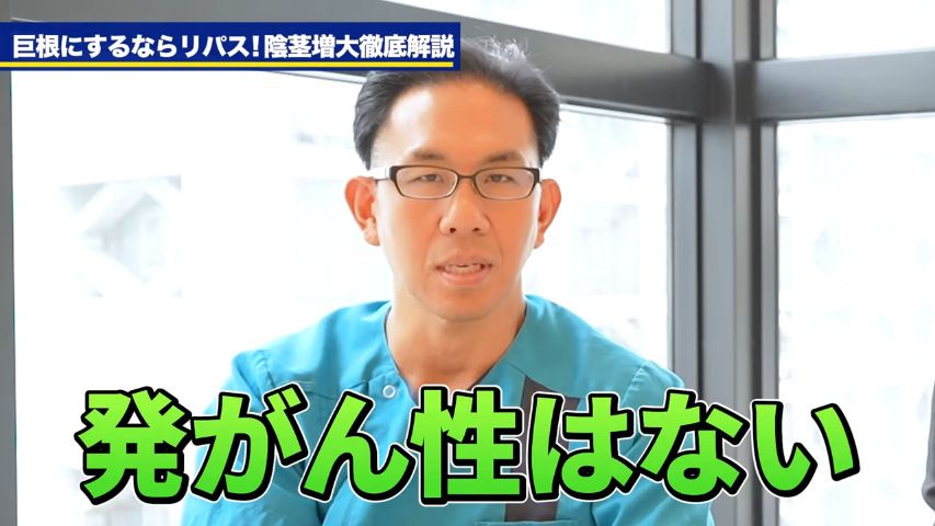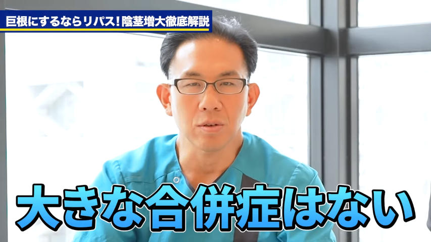 橘:隙間を埋めていくような感じですかね。そういう感じで追加注入をして、形を整えるというような意味合いで行っていくと。次にですね、リパスの安全性にについてっていう部分なんですけれども、まずこのリパスに限らず、そもそも陰茎増大の治療を行う上で、起こり得る副作用とか、合併症とか、そういった部分は何かあったりするんでしょうか?