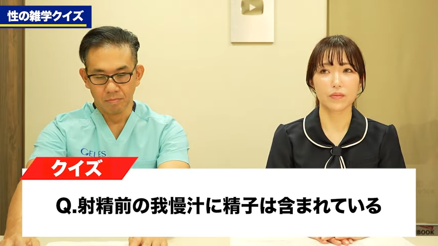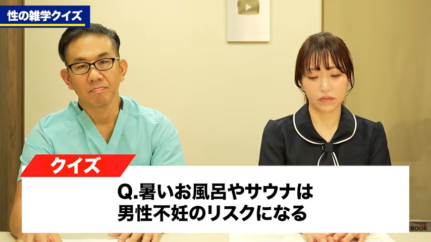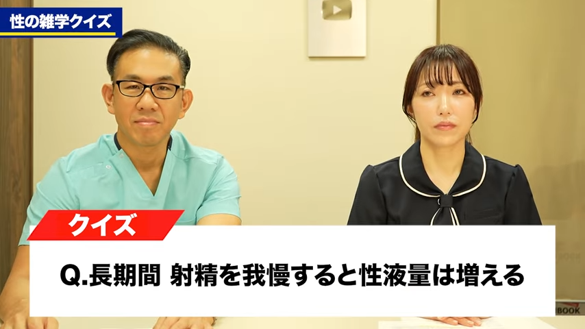 橘:この動画をご覧の皆さん、性のこと、性機能にまつわることに対してどの程度知識をお持ちでしょうか。今回は正しい知識を学んでいただくべく、性の雑学クイズというのをやっていきたいと思います。今回このクイズに関しては、私から出題をさせていただいて、川村さんに回答していただきます。その答えと解説を先生にお聞きしていきたいと思いますので、そんな感じで進めさせていただければと思います。ご覧の皆さんもぜひ一緒に答えを考えてみてください。ということで今回もやってまいりました、クイズなんですけど。川村さんとも何度かクイズやってますよね。