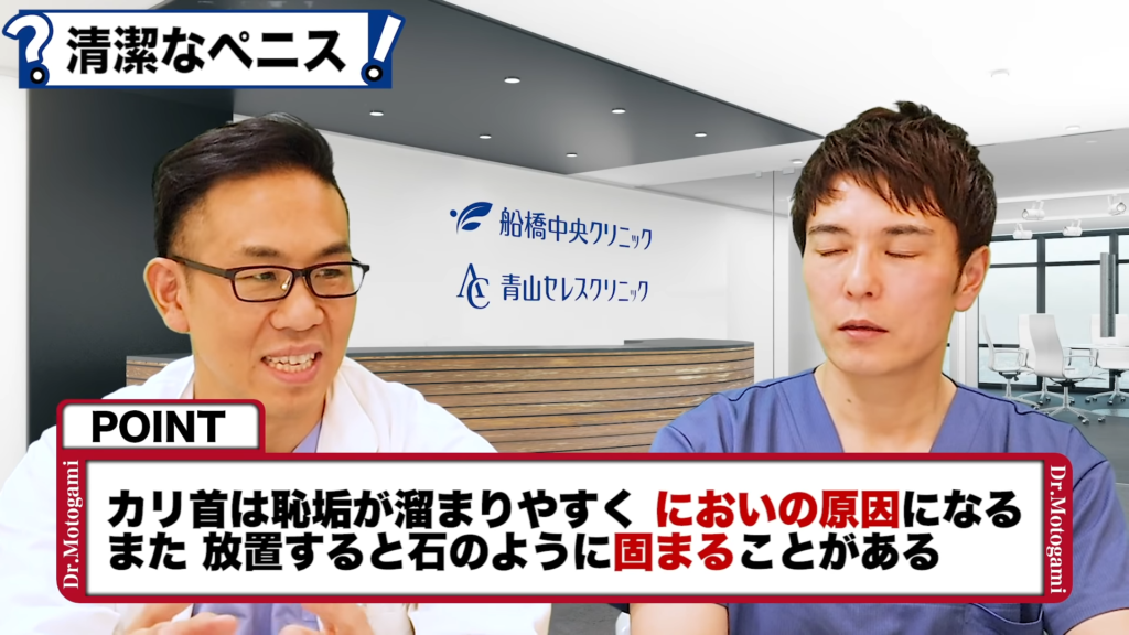 元神先生:亀頭の下ですよね。カリ首っていわれてるところが包茎ですと溜まりやすいですよね。恥垢という垢が溜まりやすいですから、それが一番においの原因ですよね。