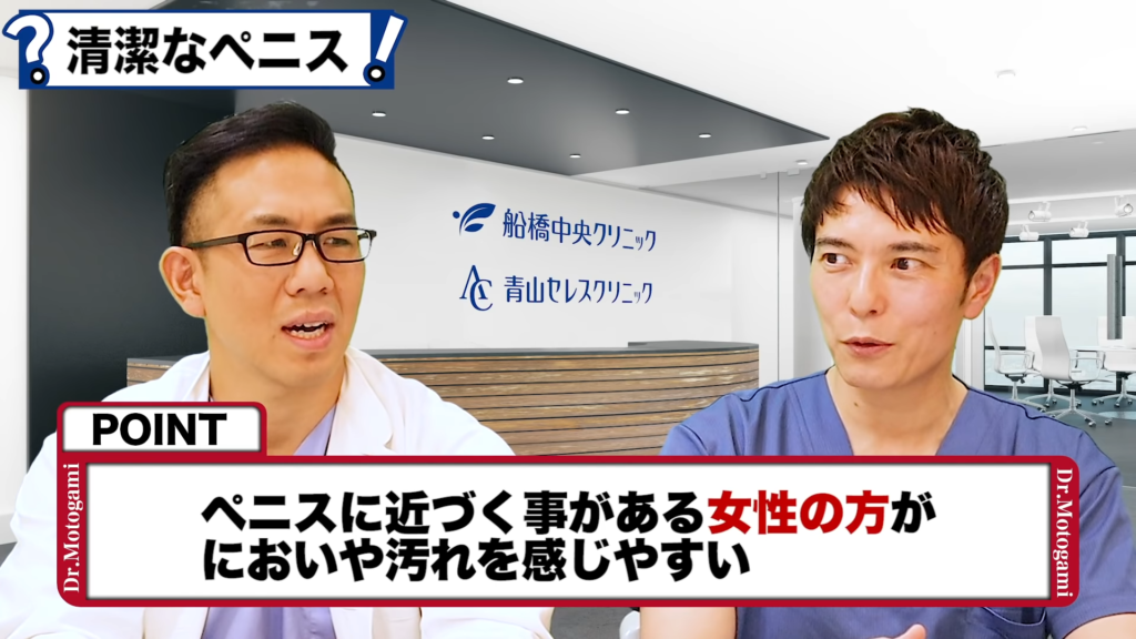 元神先生:陰部というのはやっぱり細菌が繁殖しやすい状況ですから、におったりするんですよね。陰毛もありますし、毛があると細菌が繁殖しやすいです。ペニスも特に皮がかぶってますと、皮のかぶり具合にもよりますけれども、亀頭と包皮の間が湿ったり、排尿後に残った尿が細菌と混ざって繁殖して、非常ににおいが出やすいところですよね。そのにおいがやっぱり一番不潔さを感じますよね。反対の立場で男性がもちろん、そんなにおいがあるような女性、普通は嫌だと思うんですよ。マニアックな方以外は。