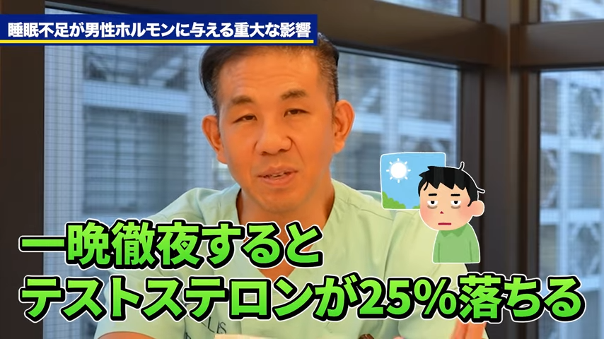 元神先生:継続的な睡眠不足も良くないんですけども、例えば一晩徹夜してしまうと、テストステロンが25%も落ちるというデータもあります。