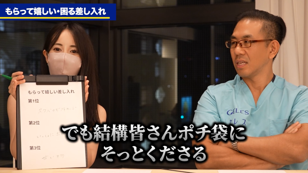 橘:今回はですね、少しゆるめな企画となっております。ソープ嬢がもらって嬉しい・もらって困るものBest3というのをちょっと教えてもらいたいなと思っております。日々、差し入れをもらうことって結構多いですか?