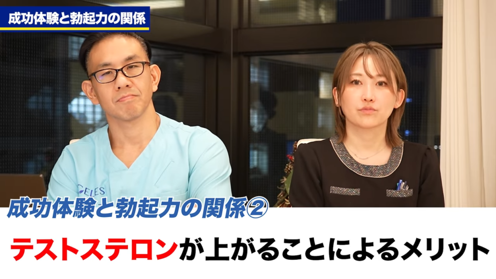橘:以前の動画の中で、成功者はテストステロンが高いみたいなお話しされてましたよね。実際に今回のテーマである「男は勝つと勃起力が上がる」、これ例えば勝つと言うと仕事でもスポーツでも色々なものがあると思いますが、その瞬間にテストステロンが上がるとも言われてるんですが、先生これは本当ですか?