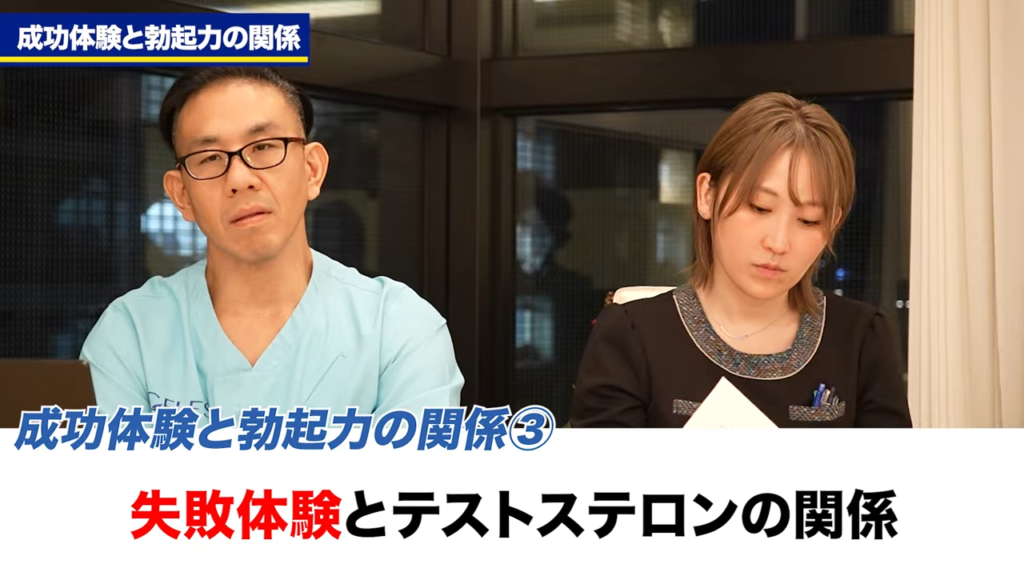 橘:実際にあとはその逆に、冒頭でも少しお話ありましたけれども、こう負けとか失敗が続くと、やっぱりそれによってテストステロンも下がり、やっぱり性機能も落ちていく。