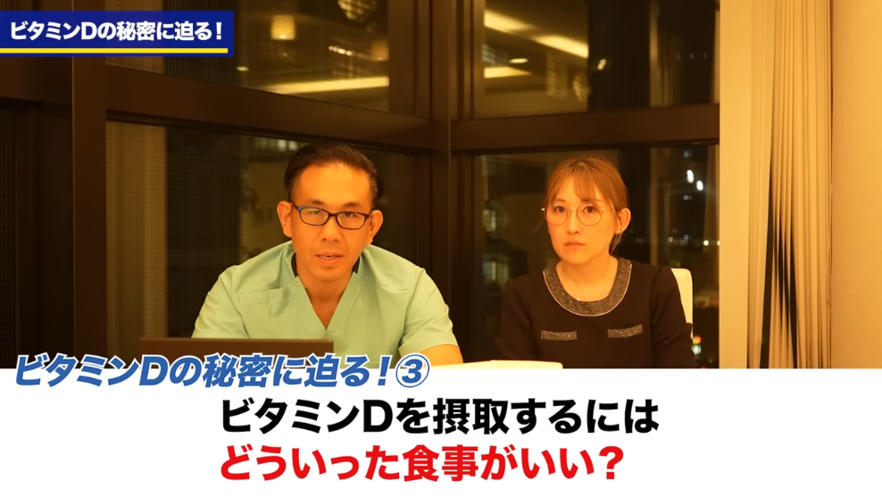 橘:実際にこのビタミンDなんですけれども、具体的にこのビタミンDをより多く出していきましょう、生成していきましょう、という話になると思うんですけれども、まずちょっと1つ目の聞き手として、その食材なんですけれども、食事とかどういうものを食べるといいっていうのは何かあったりしますか?