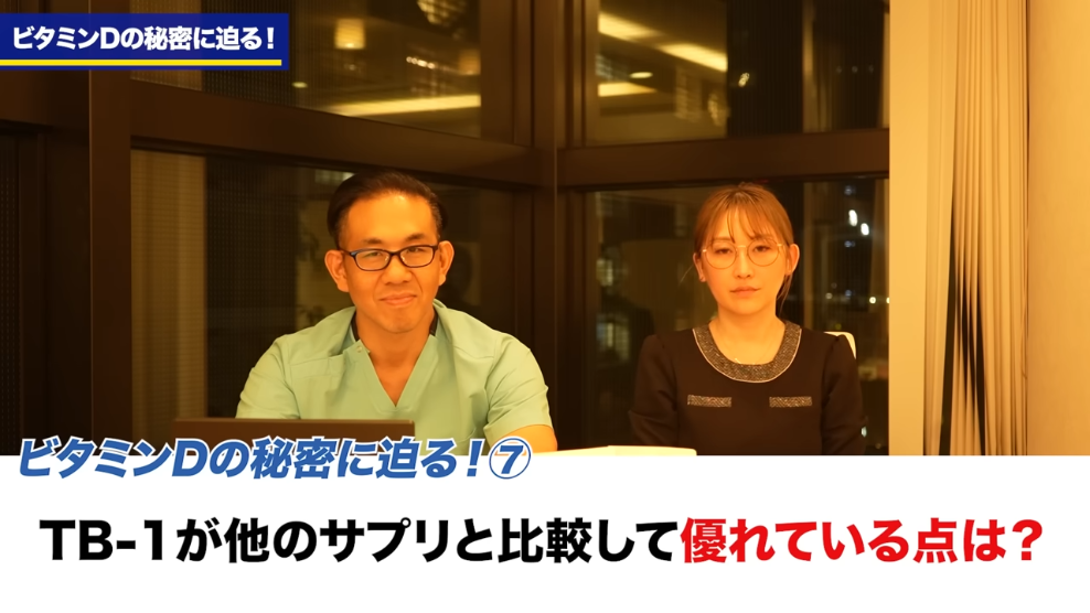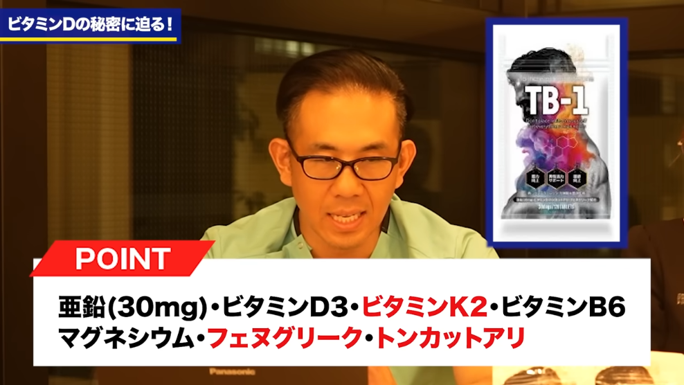 元神先生:サプリは簡単ですよね。で、ここにちょうど僕が開発したサプリがありますけど、今まで散々亜鉛が大事ってサプリ言ってきましたけど、亜鉛も大事だしビタミンDも大事なんですね。で、その亜鉛とビタミンDが両方入ったサプリってすごく少ないんですよね。それが両方入れているのがこの僕が開発したTB-1ですね。含まれていても十分な量じゃないんですよ、そのビタミンDにしても、亜鉛の量にしてもすごく少ない。体感がなかなか得にくいと思うんですよね。