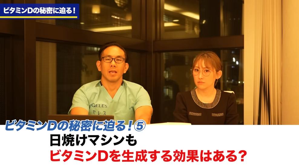 橘:先生、ちなみにこの紫外線、太陽を浴びるというところだと思うんですけど、日焼けマシンってあるじゃないですか。この日焼けマシンもUVだと思うんですけど、これも実際にビタミンDを生成する効果はあるんですか?