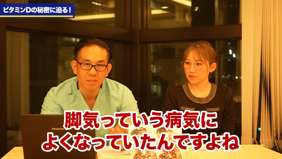 橘:先生、これまでの動画でも男性の性機能にとって、テストステロンにとって最も重要な栄養成分っていうのが亜鉛というお話、これまでいただいてきました。そしてもう1つが太陽を浴びることで生成されるビタミンDも大事というお話あったと思います。今回の動画ではこのビタミンDについて、よりちょっと深掘りしてですね、どういったものなのか?そして男性にとってどれだけ重要な成分なのか?ということをですね、今回は詳しく教えていただきたいと思います。まず、今回このビタミンDというお話なんですけど、このビタミンっていうのは、D以外にもたくさんあるじゃないですか。ビタミンCとかBとか、すごいっぱいあると思うんですけど、種類で見ると結構限りなく多いですよね?