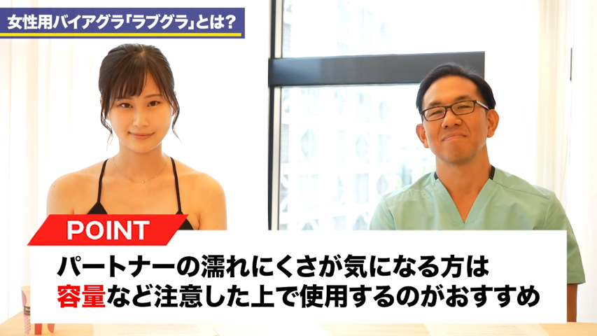 橘:気になる方はですね、ぜひパートナーの濡れにくさとかですね、そういうの気になる方一度ぜひ、ちょっとお試しいただいてもいいかなと。ただ使う際は用法用量を気をつけて使っていただくっていうことですね。