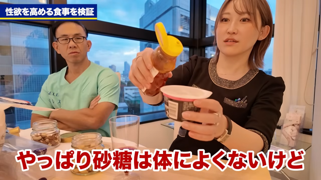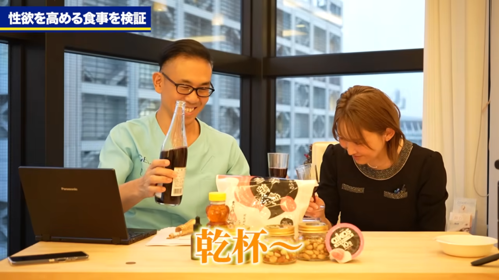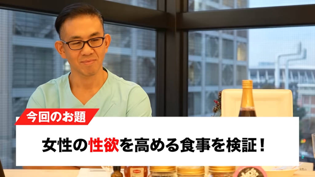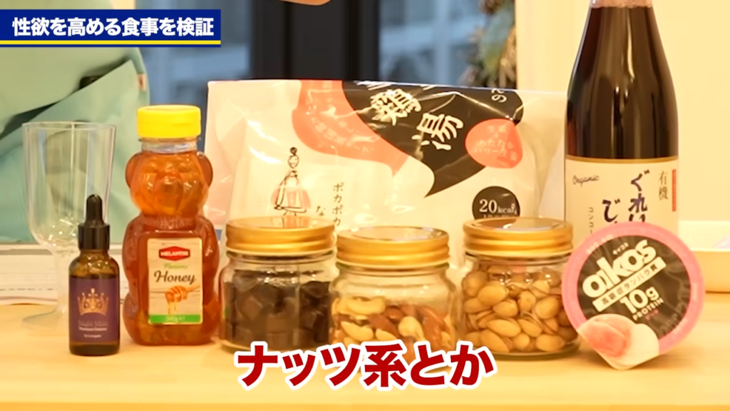 橘:今日の動画、このオープニング、伊藤さんが不在です。ちょっと今回は2人でのオープニングになるんですけれども、今日は検証動画となっておりまして、今日は目の前にいくつか食材が並んでおりますが、今日の検証テーマは「女性の性欲を高める食事」というテーマで検証を行っていきたいなと考えております。